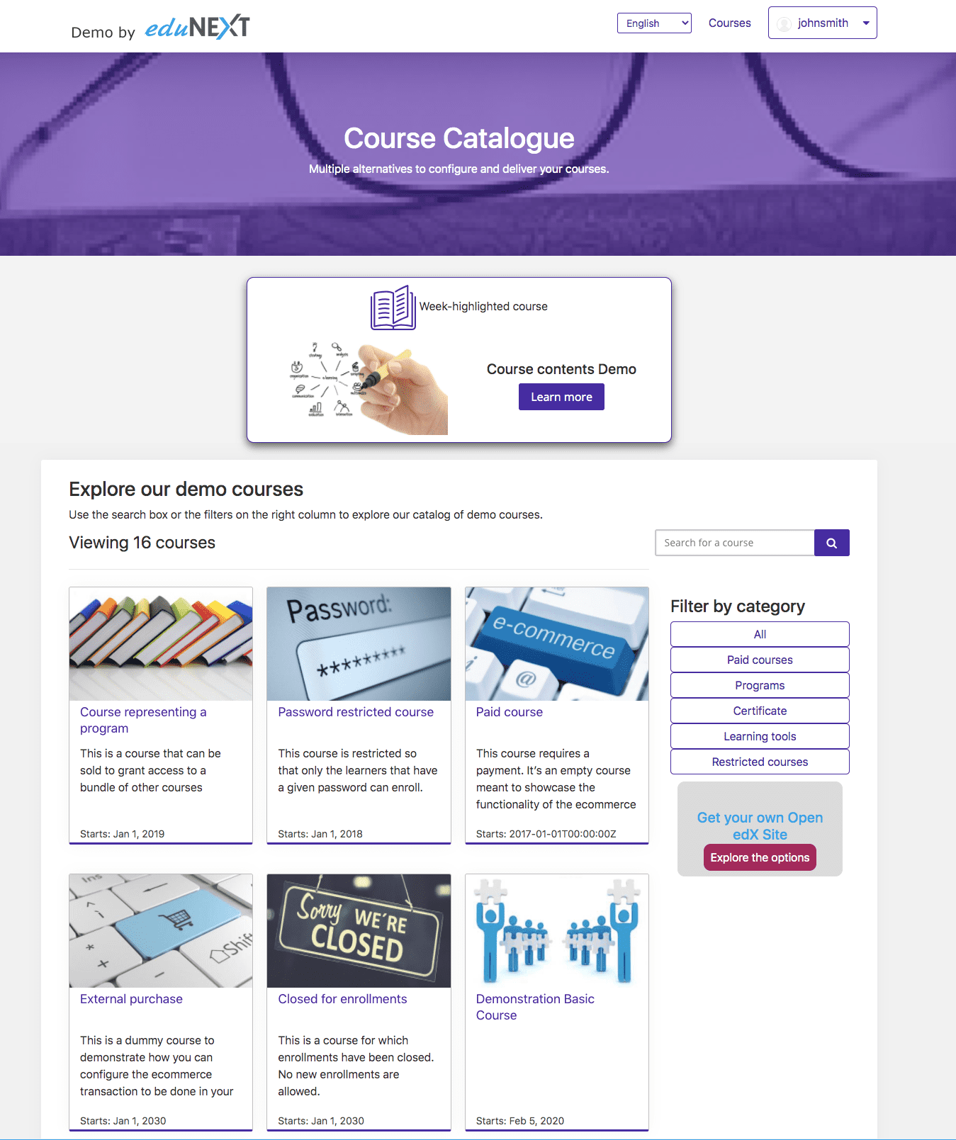Learners will be able to search by keywords or filter the courses by some criteria.