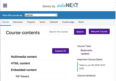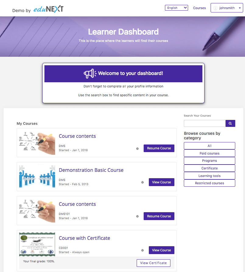 After login, the user normally lands in the learner dashboard, where he/she sees all the courses in which he is enrolled.